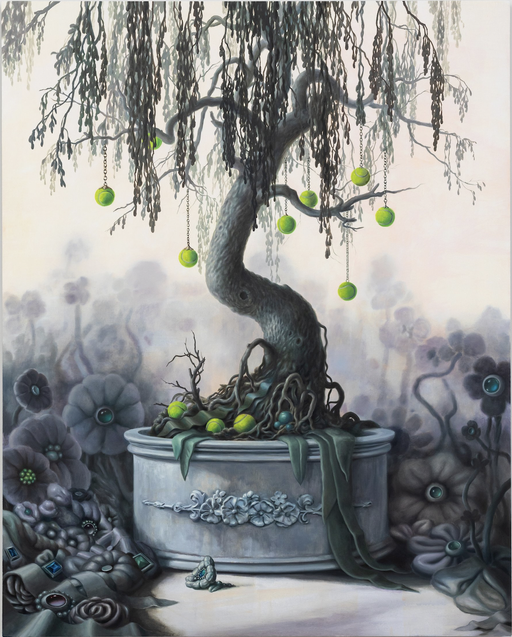 Kirsten Deirup’s exhibition of paintings and works on paper emerge out of this tradition in Western art. Much like her historical precedents, a darkness or post-apocalyptic atmosphere frames a central flower pot of decay. But what reality is this? In place of an extinguished candle, unplugged power cords imply the botanicals lifeless. Bejeweled flowers droop as they transition to the afterlife, attempting to take their precious earthly goods with them in vain,. In Year Zero, Deirup teases us further with a tree dangling mini tennis balls in lieu of fruit. Is thisl an AI prompt gone wrong? Deirup’s work subtly addresses the new reality emerging out of our ubiquitous screens. With AI tools readily available to the masses, online image propagation has gone wild. The still life here is no longer a perception of what see in front of us, but the absurd visualization of a reality lost in translation.